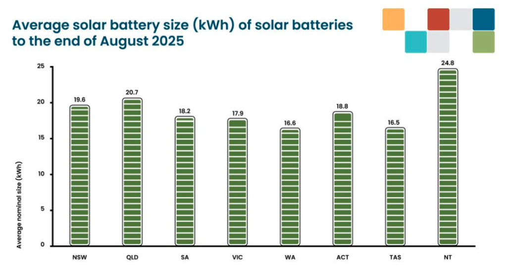 The average Australian home has a nominal installed battery size of 19 kWh, with the Northern Territory leading at 24.8 kWh.